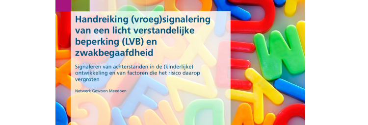 Voor professionals in het sociale domein is het belangrijk dat zij een licht verstandelijke beperking of zwakbegaafdheid niet alleen bij kinderen en jongeren, maar ook bij (jong)volwassenen, zo vroeg mogelijk herkennen om overvraging te voorkomen. Deze handreiking beschrijft de mogelijkheden voor vroegsignalering van een LVB/zwakbegaafdheid.